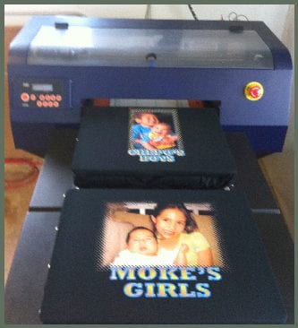 Unlike the heat transfer shops of the late 1970’s where you would go to a mall shop or store and look through catalogs of pre-made art and designs and select one to be heat pressed onto a t-shirt, digital direct to tee shirt printing actually takes any digital image or photo and prints it directly onto the garment. This technique uses a modified ink or bubble jet printer with custom water-based inks to print in stunning 4800 dpi detail and color.